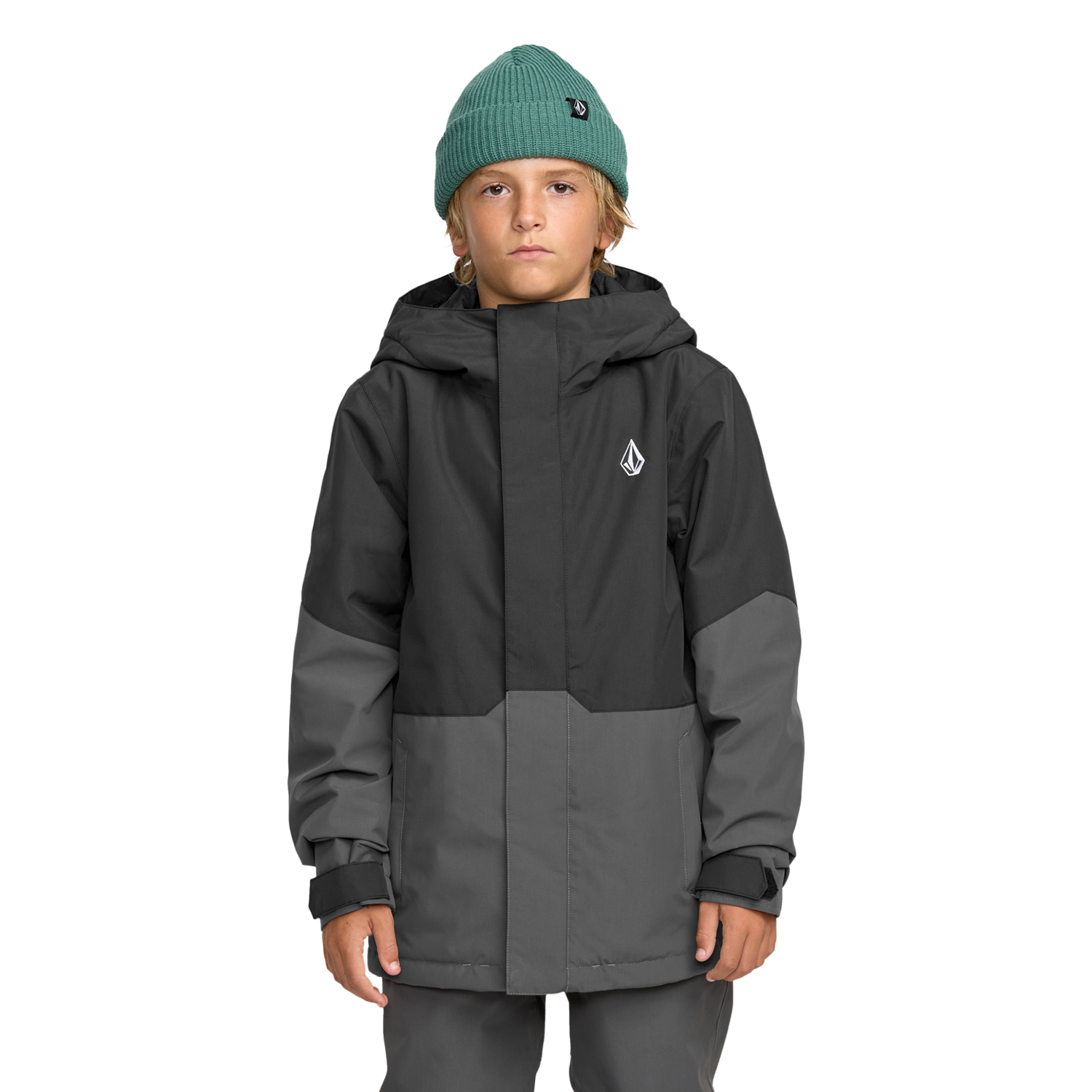 The Volcom Kids Vernon Insulated Jacket adds 100/80g recycled insulation with a taffeta lining, relaxed mid-length fit, and an adjustable powder skirt. A helmet-compatible hood with a youth-safe internal elastic hood gaiter and Super Suede chin guard keeps comfort high, while Zip Tech® interface, brushed tricot handwarmers, and a left-sleeve pass pocket with leash keep the day moving.