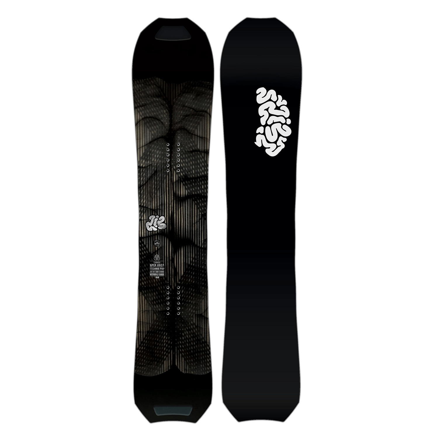 The Lib Tech Men's Apex Orca Snowboard is a directional all-mountain board built with Techno Pop carbon construction, combining unidirectional carbon, 30° Carbon Mega X, and magnesium fiber bands over a recycled PET, Paulownia, and Aspen core. Its C2x contour blends central rocker with a powerful camber tail for precise carving, stability, and float in varied conditions, while Anti Matter 3-D tips and tails reduce swing weight and enhance mobility in technical terrain. The sintered knife-cut base, eco-sublimated bio beans topsheet, and Magne-Traction serrated edges optimize speed, edge hold, and control across resort terrain.