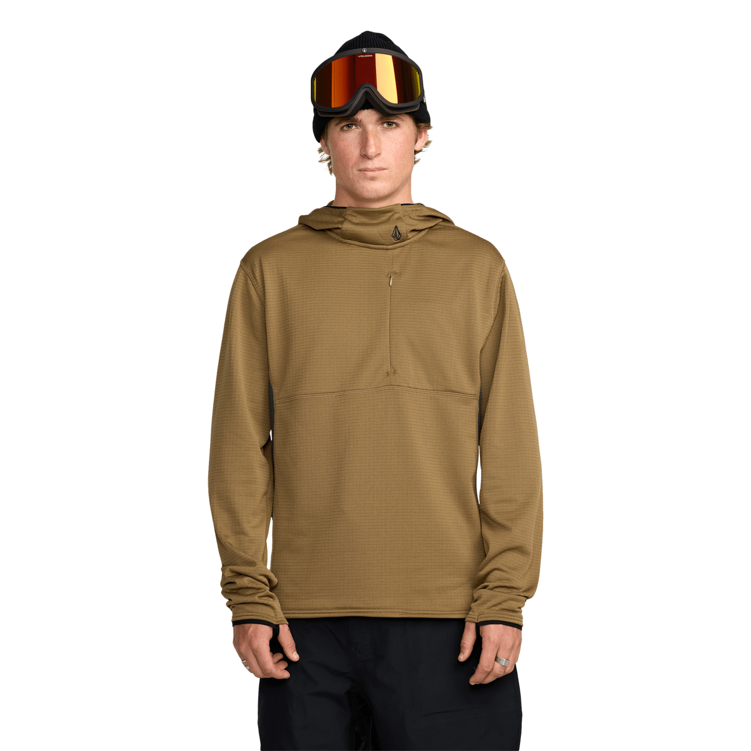 The Volcom Men's Gridlock Hooded P/O Fleece adds a zippered chest pocket with an internal cell phone pocket, plus Lycra thumbhole loops for sealed-up sleeves in cold chair rides. Brand: Volcom. Product: Men's Gridlock Hooded P/O Fleece.