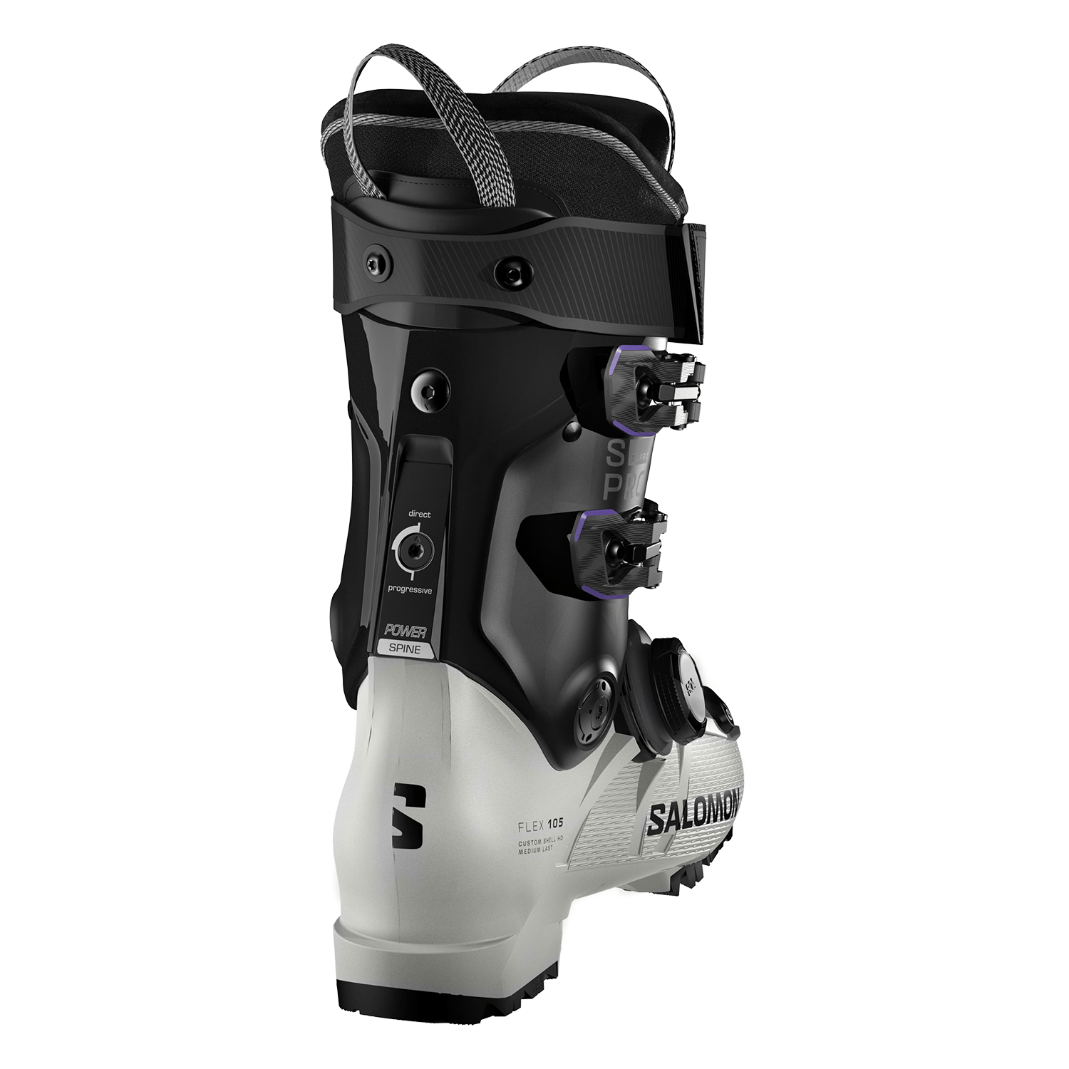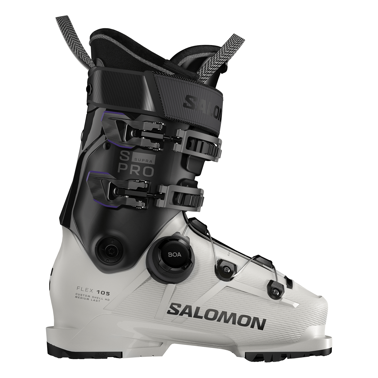 Salomon S/Pro Supra BOA® 105 GW Ski Boot combines a precise BOA® Fit System with Exowrap™ construction for a secure, micro-adjustable fit. The medium-width Custom Shell™ HD and My Exowrap™ 4D Perf liner deliver tailored comfort, while the women-specific cuff adjuster and anatomic design enhance calf fit.