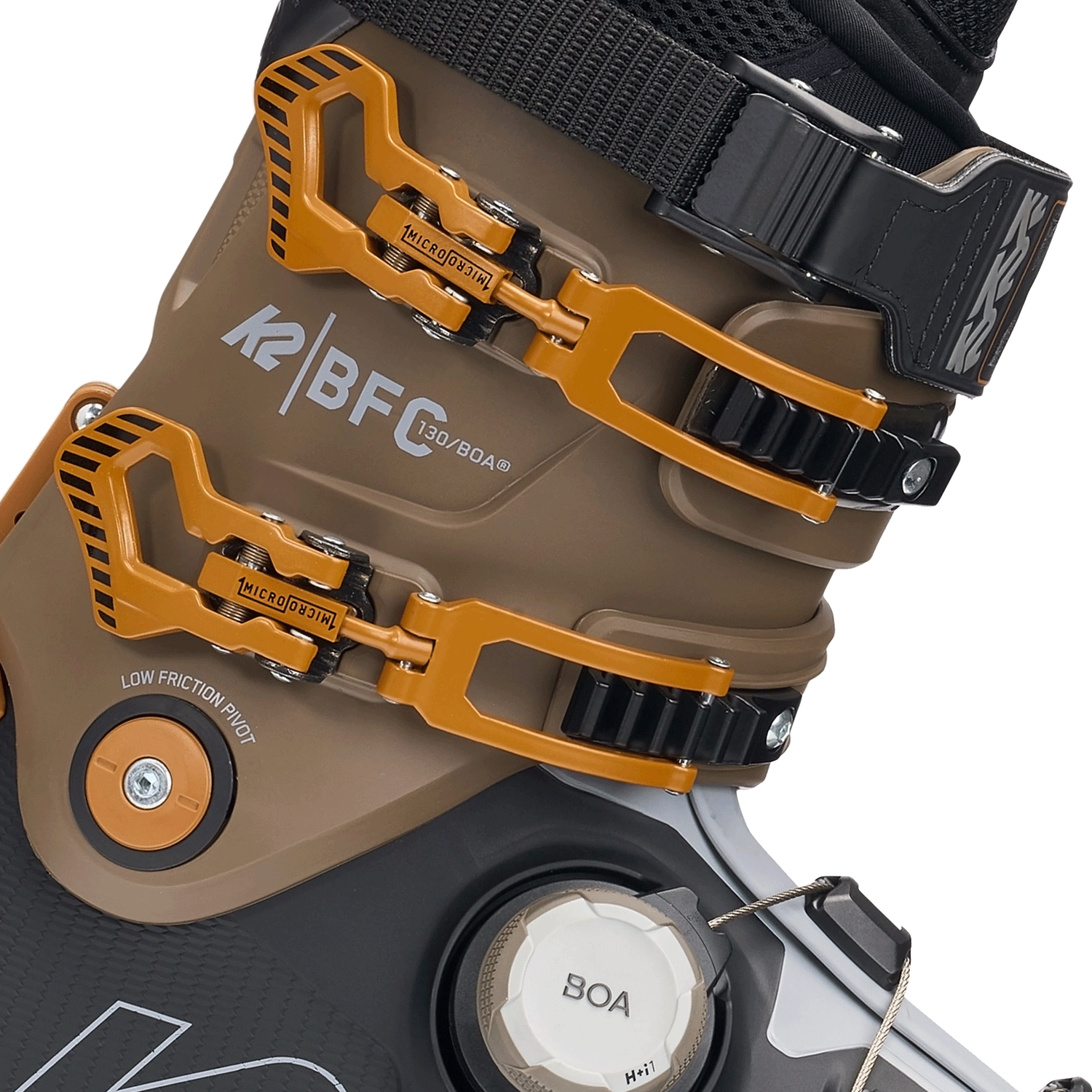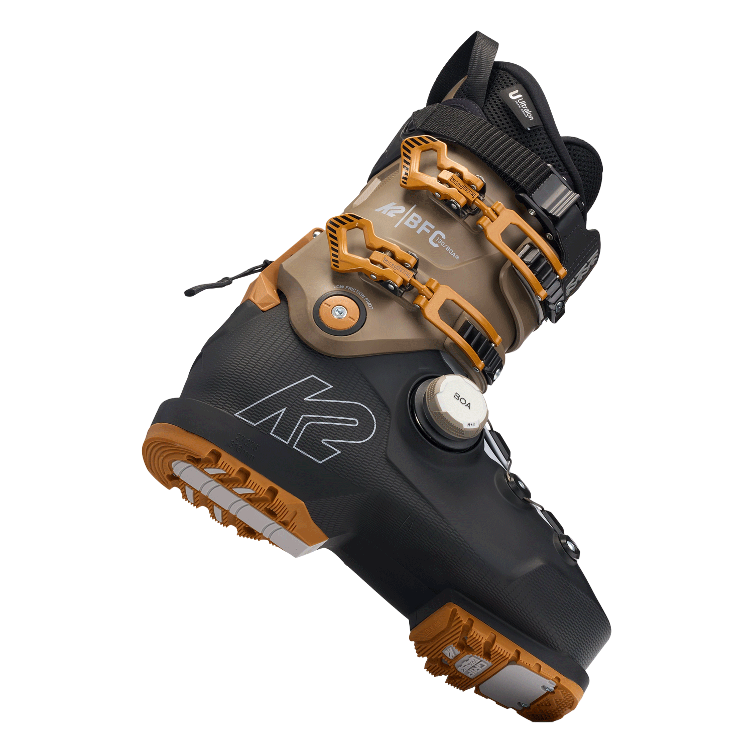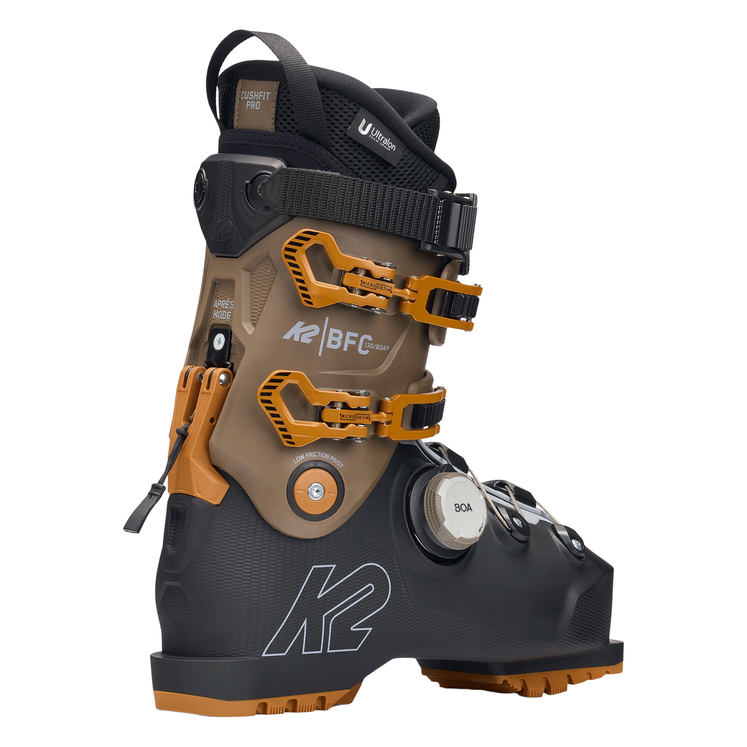 Inside, the CushFit Pro liner uses Ultralon foam for increased support and heat-moldable customization. The 103mm MultiFit™ high-volume last, FastFit instep, adjustable cuff, and Apres Mode 2.0 walk mechanism balance performance with day-long comfort. K2 BFC 130 BOA finishes with GripWalk® soles for confident traction off snow.