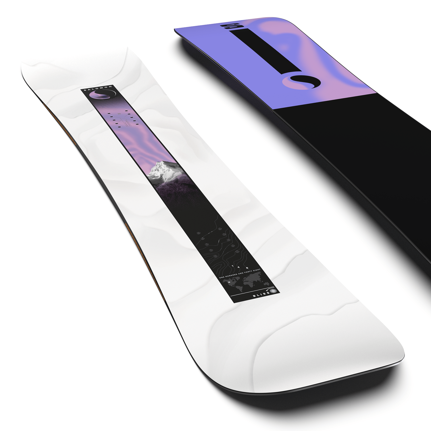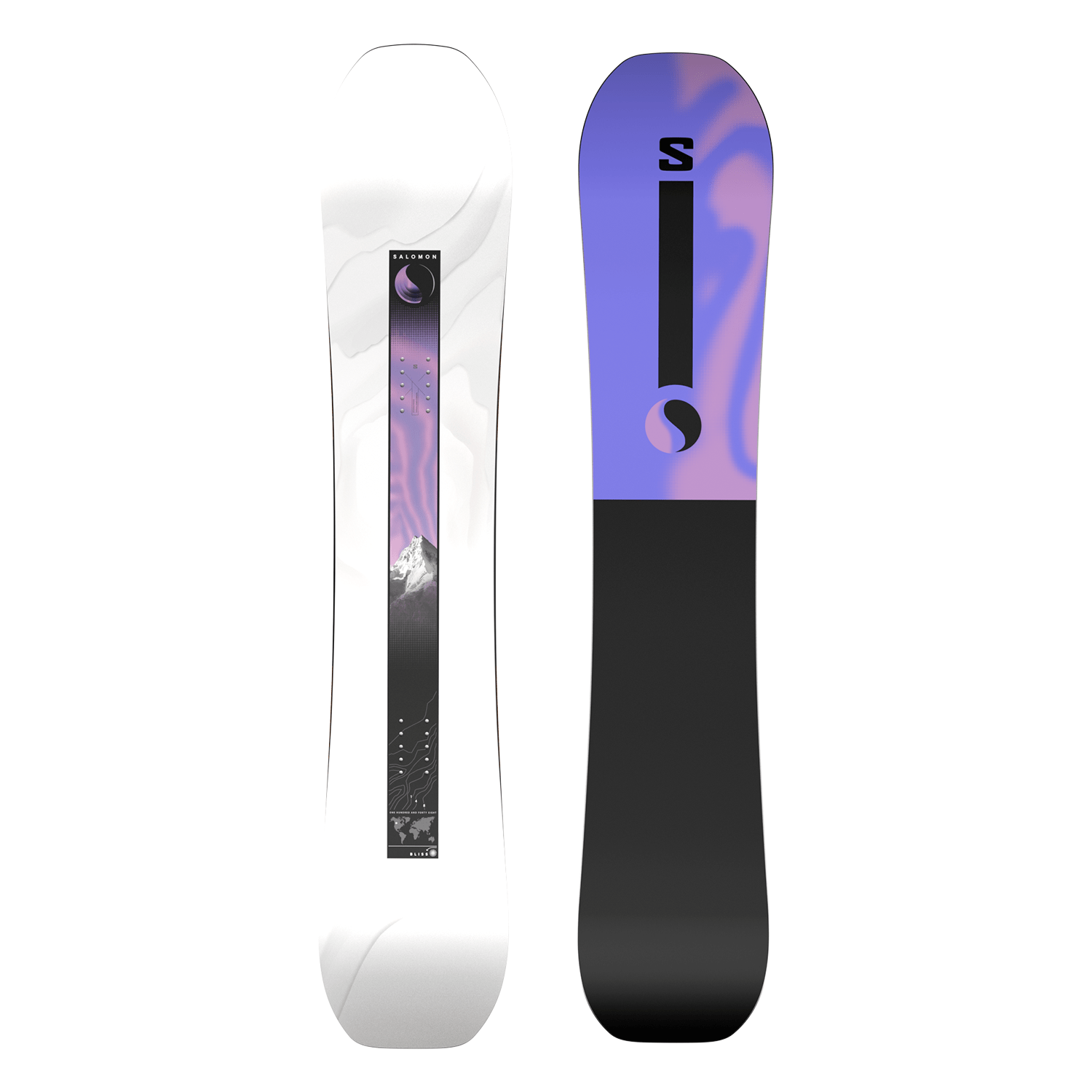 The Salomon Women's Bliss Snowboard is an all-mountain board with a freeride-inspired tapered directional shape that enhances float and turning precision. Its Cross Profile camber blends camber underfoot with rocker at the tip and tail for stability on groomers and improved float in softer snow. Constructed with a Popster wood core, BIAX LD fiberglass, Royal Cork Pads, and cork rails, the board delivers responsive flex, vibration dampening, and a smooth ride, while an extruded EG base and All-Mountain EB edges provide consistent glide and reliable edge control across varied conditions. Compatible with 4x2 bindings, stance is adjustable.