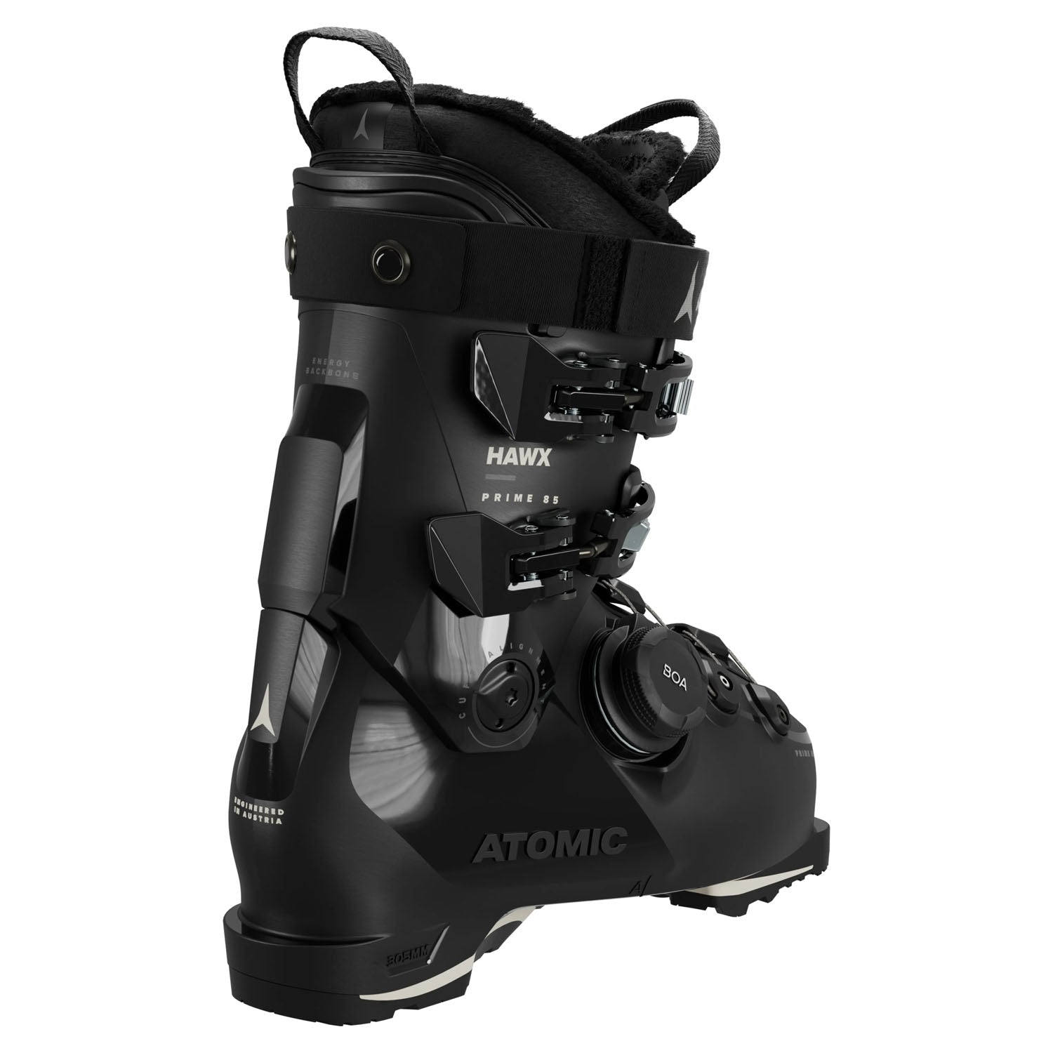 The Atomic Hawx Prime 85 BOA W GW Ski Boots feature a redesigned exterior, improved step-in ease, and enhanced Memory Fit heat molding for a more customized fit. The BOA® Fit System lower cable closure ensures even pressure distribution across the foot, allowing for precise adjustments that optimize both comfort and control. Heat molding is recommended at an Atomic dealer for the best results.