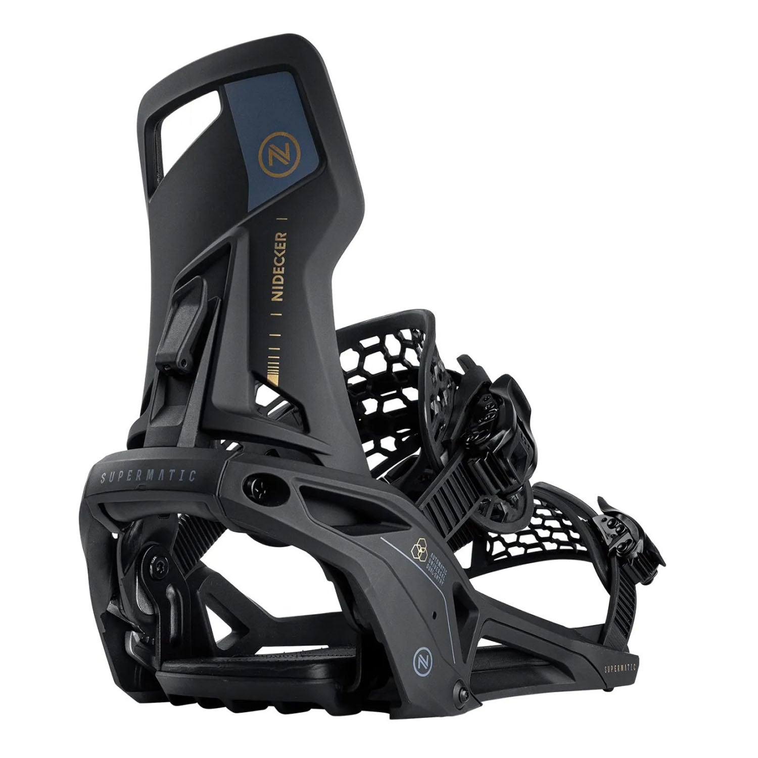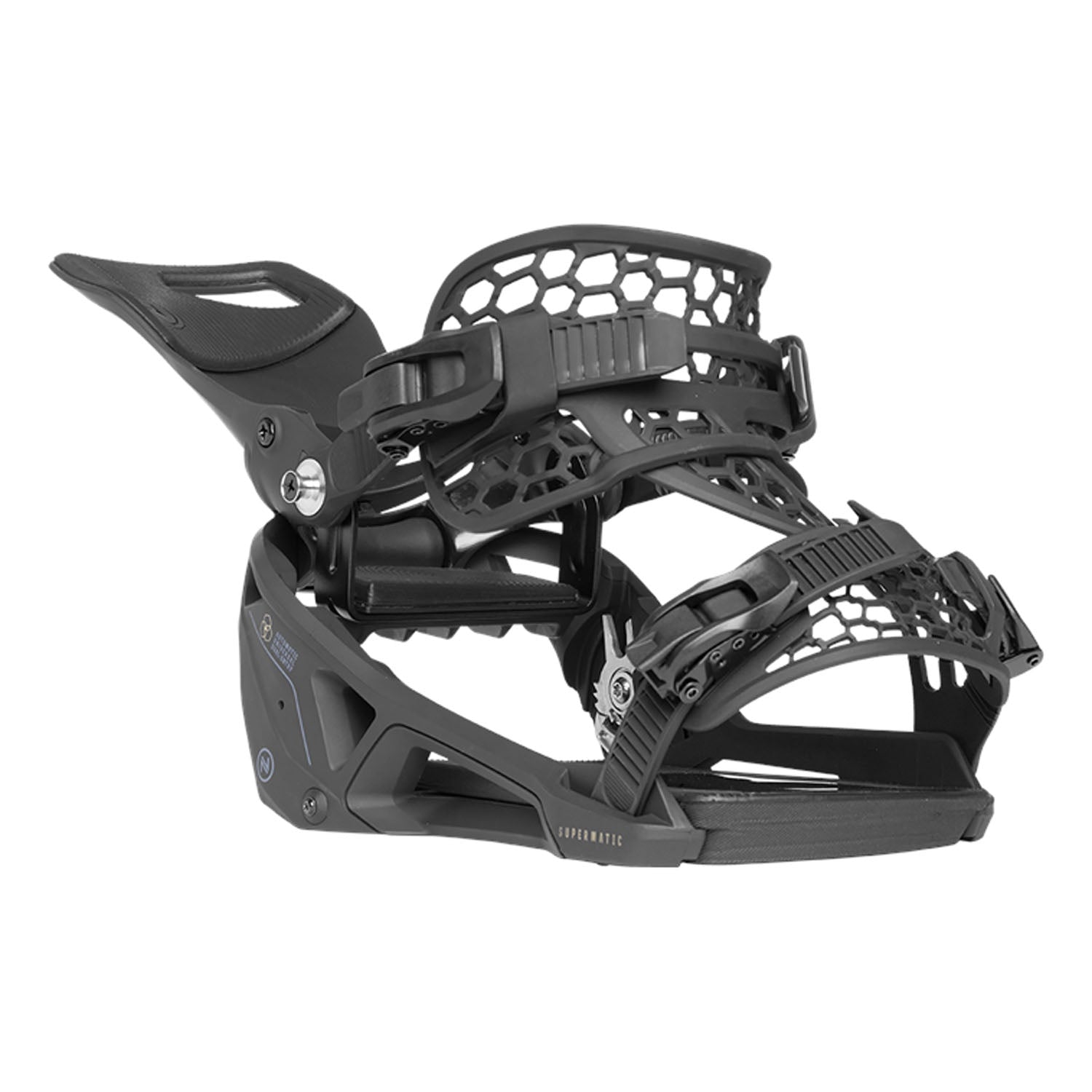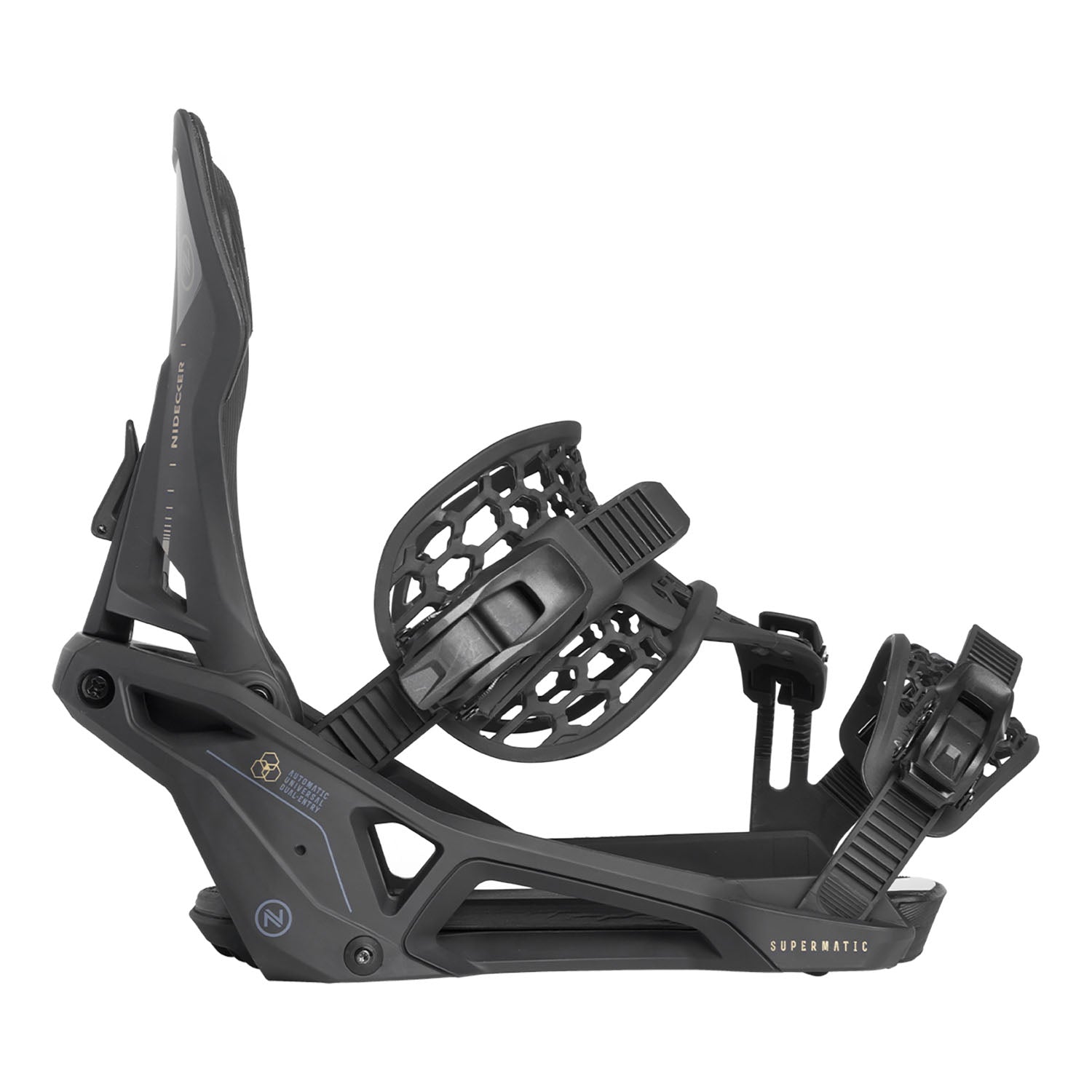 The Nidecker Supermatic® Snowboard Bindings combine innovative automatic entry with a simple step-in mechanism and quick-release lever, making transitions from lift to slope effortless. Built with durable materials like a glass-filled nylon baseplate and AuxTech® straps, they provide a secure fit and responsive ride. Their universal boot compatibility eliminates the need for system-specific boots, offering versatility for all riders. Ideal for resort, powder, and varied conditions, these bindings offer the flexibility to tackle any terrain.