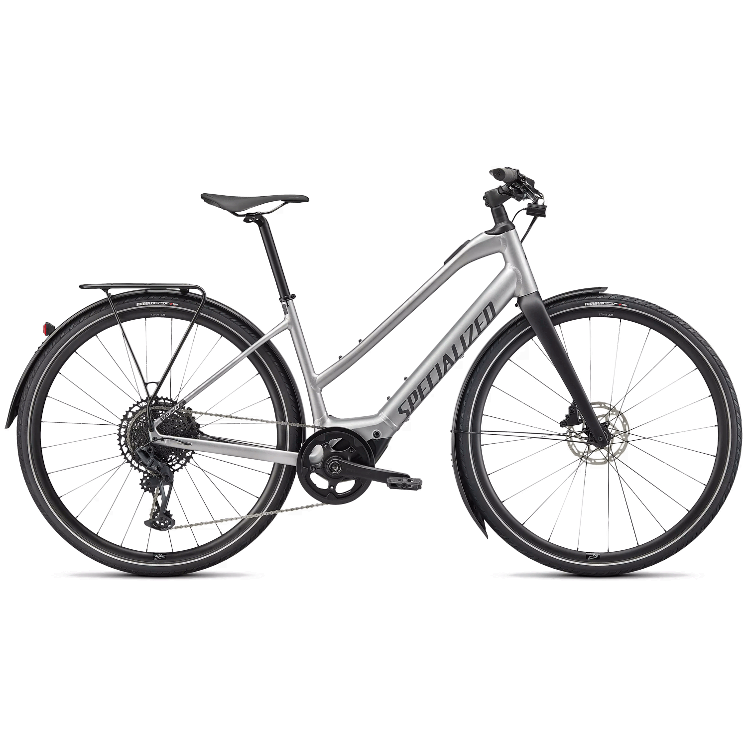| Frame | E5 Aluminum, bottom bracket motor mount, fully integrated downtube battery, internal cable routing, front rack mounts, Smooth Welds |