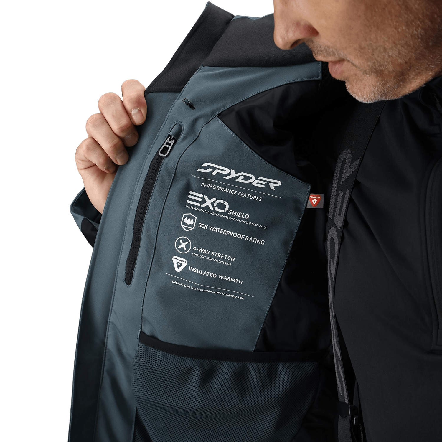 EXO SHIELD 30K/20K fabric delivers 30,000 mm waterproofing and 20,000 g breathability, keeping the Spyder Men's Titan Jacket lightweight yet resilient on wet, cold slopes. PrimaLoft® Black ECO insulation (60 g) provides down-like warmth without bulk, while interior stretch panels ensure full freedom of movement.