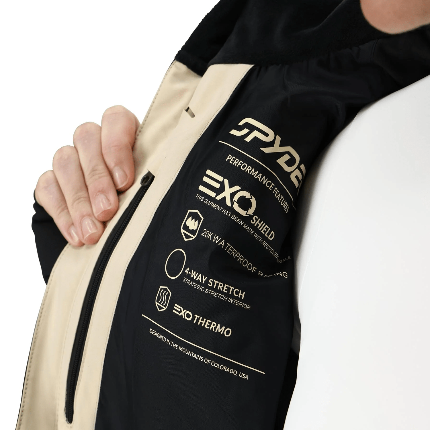 - Fabric: 4-way stretch EXO SHIELD nylon plain weave, 20K/20K laminate, DWR